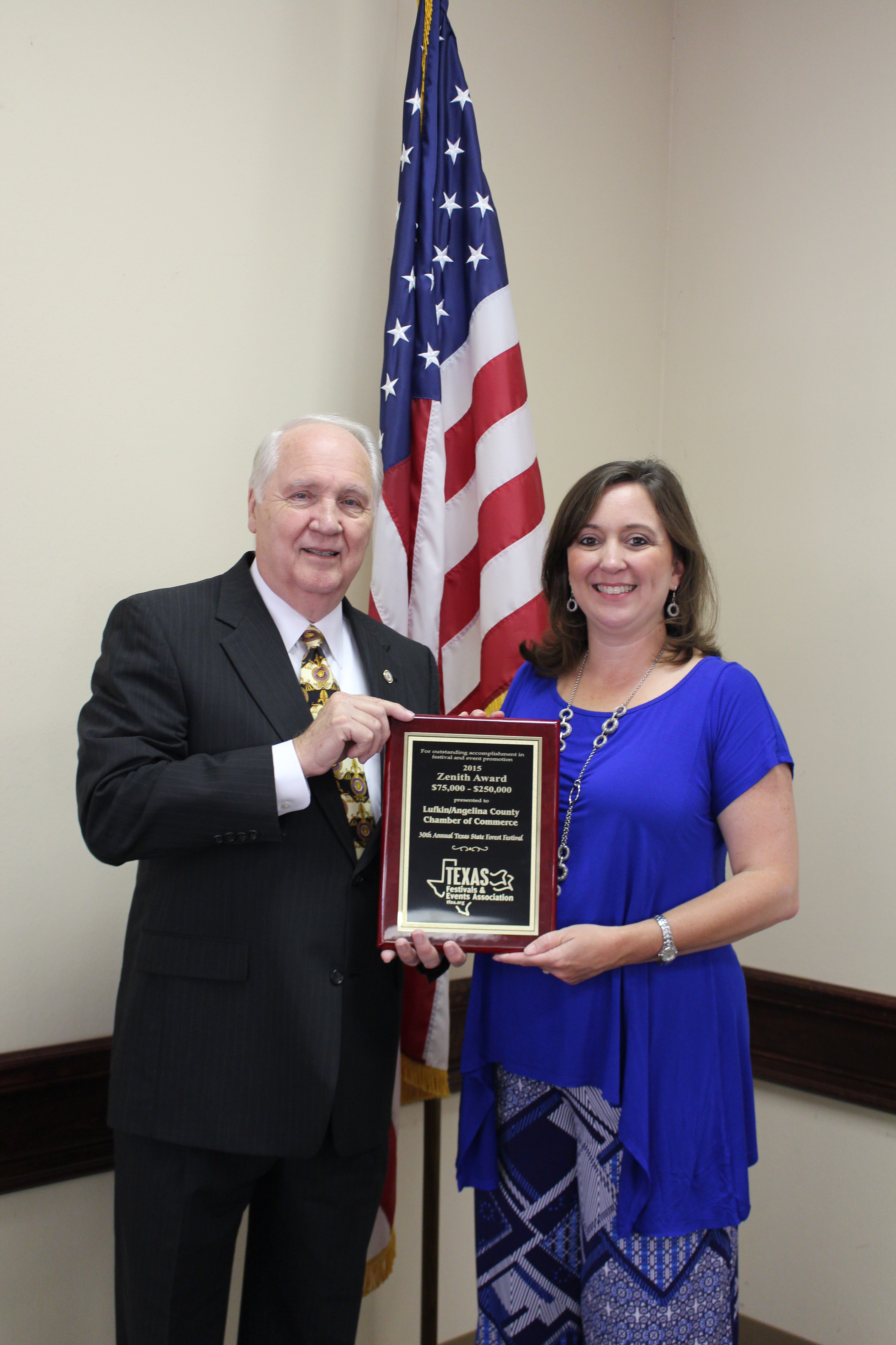 After another successful Texas State Forest Festival, the Lufkin/Angelina County Chamber of Commerce brought home 31 different awards from the Texas Festivals and Events Association (TFEA). The Lufkin/Angelina County Chamber of Commerce won the Zenith award; which is presented to the best 2014 festival in the state in each budget category. The Chamber was also presented with twenty 1st place awards, eight 2nd place awards and three 3rd place award.