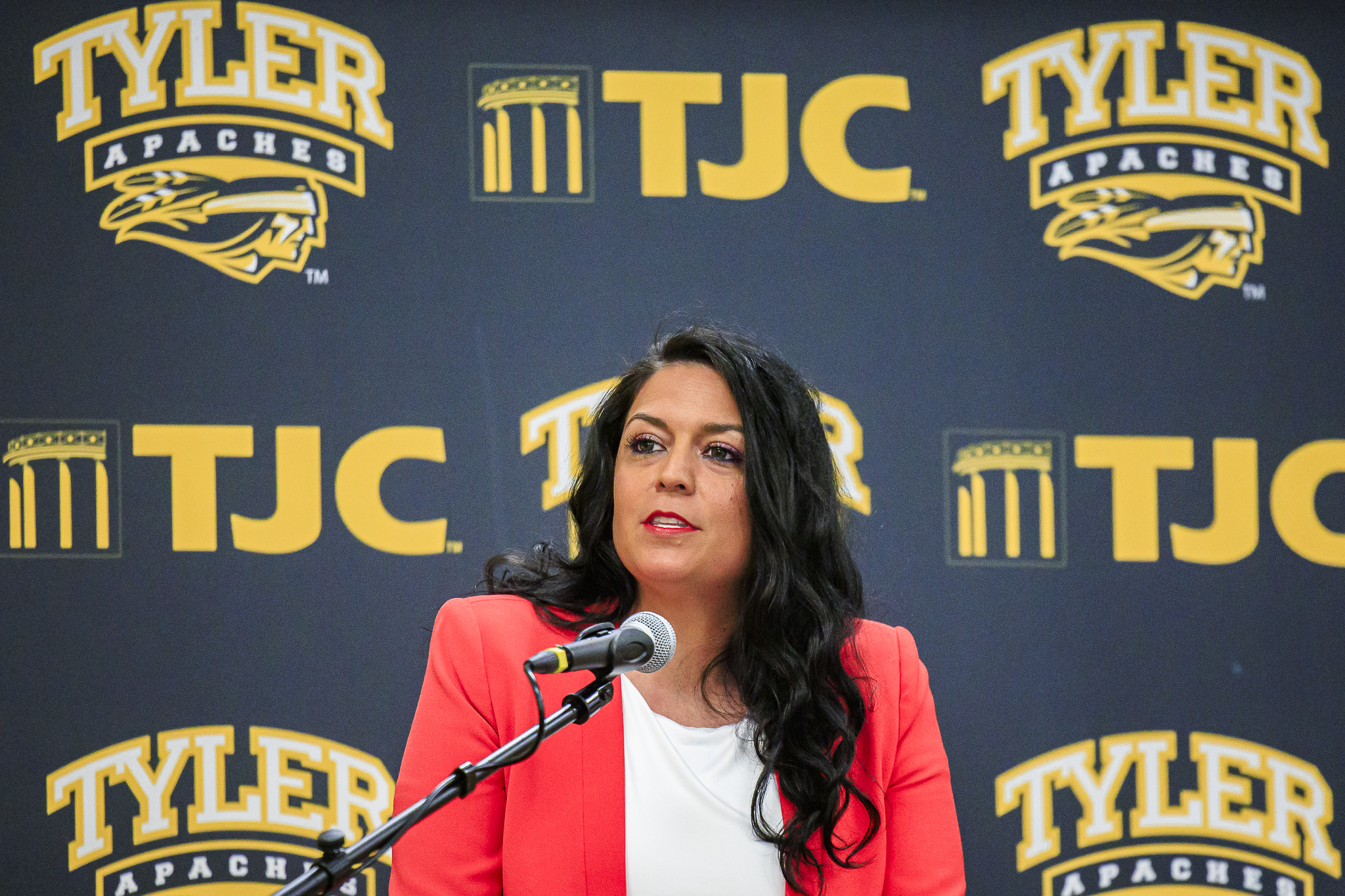Lady ‘Runner head coach Addie Lees, in her first year with AC after having spent four years coaching Region XIV rival Kilgore College, gave a nod to the familiar faces in the crowd while reminding them of her coaching style.
