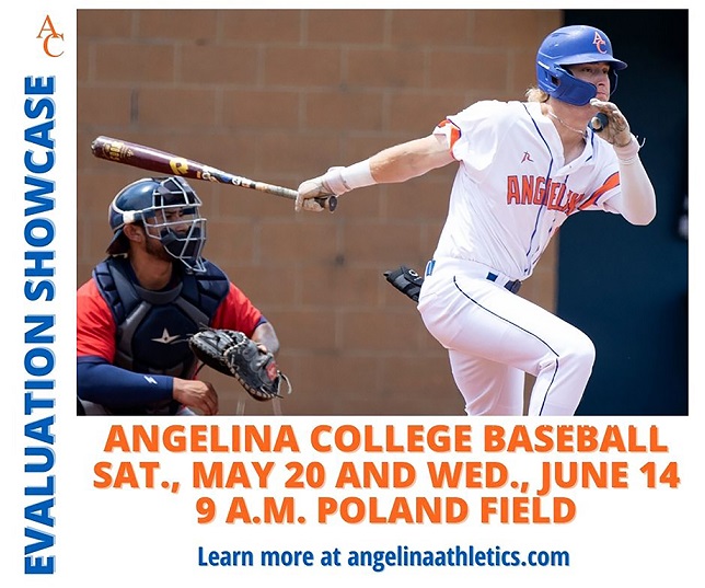 In an effort to locate even more future Roadrunners, the AC baseball team will hold a pair of evaluation showcases for prospective players ages 16 and older. The first session will take place at 9 a.m. on Saturday, May 20, while the second session takes place at 9 a.m. on Wednesday, June 14. Both sessions will be at Poland Field on the Angelina College campus.