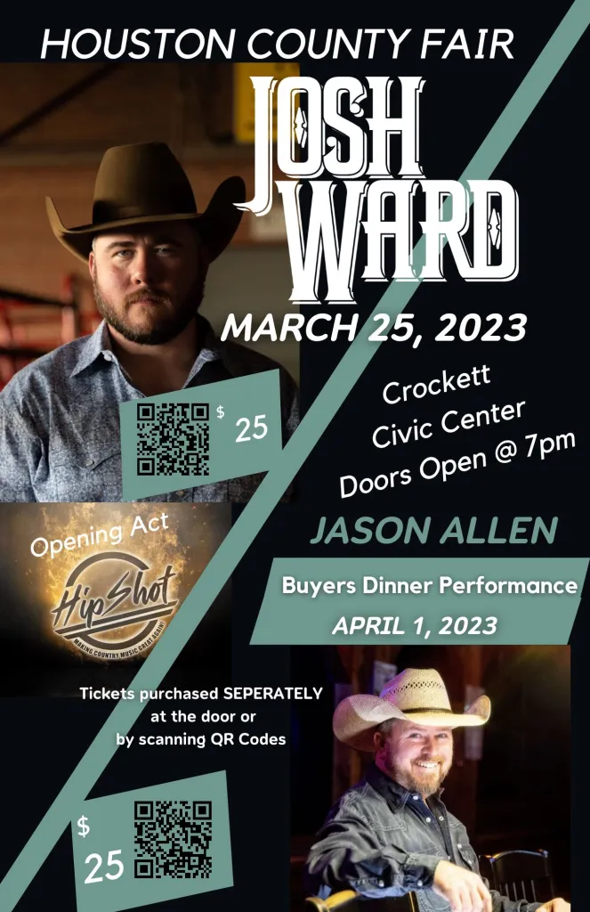 Country singer Josh Ward will open this year’s Houston County Fair on Saturday, March 25, 2023 at the Crockett Civic Center at 7 pm, located at 110 Edmiston Drive.