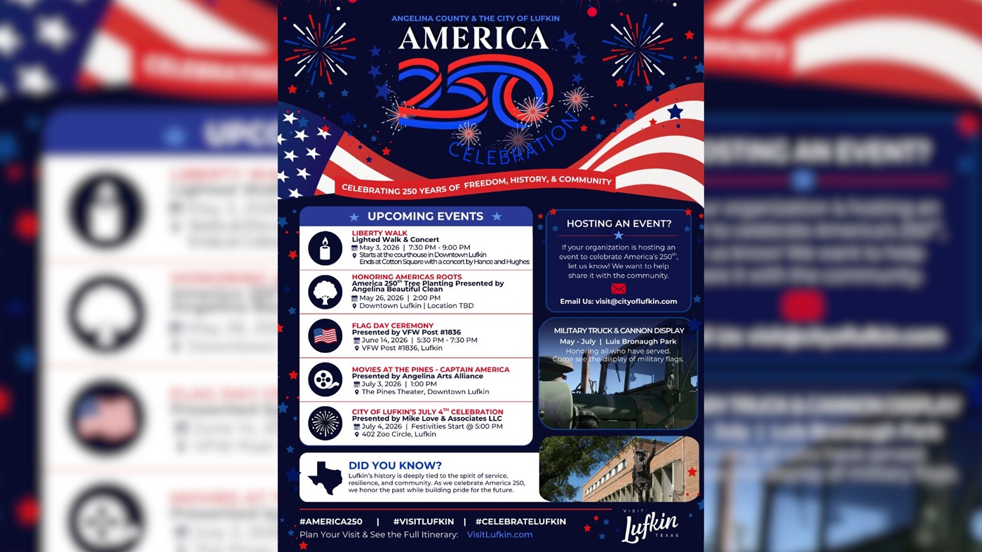 LUFKIN, TEXAS — The City of Lufkin, Angelina County, and community partners are proud to announce a series of events celebrating America’s 250th anniversary, bringing together residents and visitors to honor the nation’s history, community spirit, and shared future.