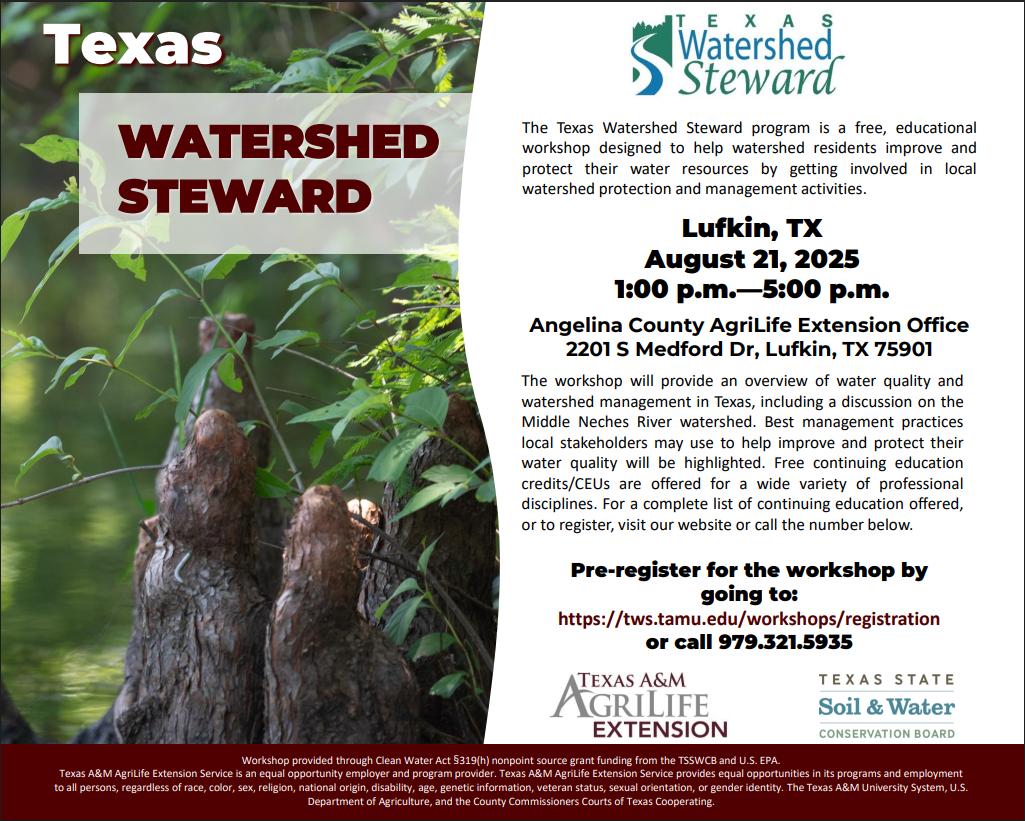 The free event will be held at the Angelina County AgriLife Extension Office, 2201 S Medford Dr, from 1:00 p.m.-5:00 p.m. and is open to anyone interested in improving the region’s water quality.
